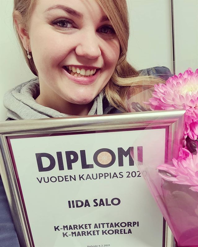 Iida Salo on palkittu Vuoden kauppiaan diplomilla. Iida luotsaa Kotkassa kahta K-Marketia, Aittakorpea ja Korelaa. K-Market-ketju palkitsi kauppiaitaan torstaina 4.2. kauppiastapaamisessa, joka poikkeuksellisesti striimattiin tänä vuonna. Vuoden kauppiaan diplomi myönnettiin 11 K-Market-kauppiaalle ympäri Suomen. Diplomi heti ensimmäisenä kauppiasvuotena Iidalla on meneillään vasta ensimmäinen kauppiasvuosi ja hänet palkittiin jo nyt. ”Kauppiuutta takana vajaa 10kk, vetää melko sanattomaksi tällainen palkitseminen tässä vaiheessa uraa” Iida iloitsee. ”Tämä on ensisijaisesti tunnustus työlle, jota timanttinen henkilökuntani tekee päivästä toiseen, ja jota kauppiaan on kunnia seurata, tukea ja kannustaa. Suuri kiitos heille ja suuri kiitos meidän asiakkaille, joita varten tätä työtä saadaan tehdä. On upeaa kehittää näistä kaupoista meidän asiakkaiden näköisiä, rentoja ja lämpöisiä oman kylän…