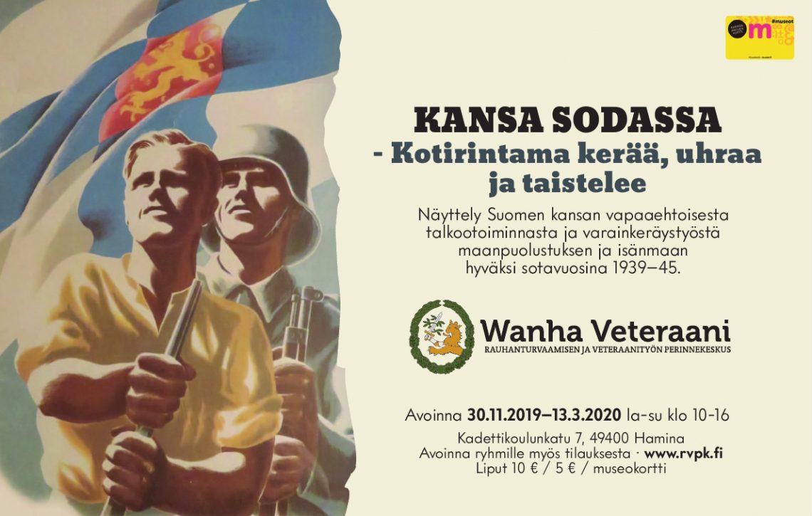 Julisteet olivat sota-ajan tiedonvälitystä. Näyttelyjulisteen pohjana on ajan kuvaa. Wanha Veteraani Kansa sodassa – kotirintama kerää, uhraa ja taistelee on Rauhanturvaamisen ja veteraanityön perinnekeskus Wanhan Veteraanin talvinäyttely. Se avataan Haminassa talvisodan syttymisen 80-vuotismuistopäivänä. Näyttely kertoo Suomen kansan vapaaehtoisesta talkootoiminnasta ja varainkeräystyöstä maanpuolustuksen ja isänmaan hyväksi sotavuosina 1939–45. Talkoo- ja keräysaihekokonaisuuksia on näyttelyssä kaikkiaan yksitoista linnoitustalkoista kultakeräyksiin ja maaottelumarssista sota-ajan veripalveluun. – Tällä näyttelyllä Wanha Veteraani jatkaa ennakkoluulotonta otettaan ja tuo esiin sitä, mitä ei ennen ole juurikaan nähty, näyttelypäällikkö Ismo Flink sanoo. Kansa sodassa -näyttelyn julisteiden, kunniakirjojen ja pienpainatteiden joukossa on ainutkertaista ja jopa ennen esittelemätöntä aineistoa. Näyttely on auki viikonloppuisin klo 10 – 16 talvisodan alkamisen ja päättymisen muistopäivien välisenä aikana…