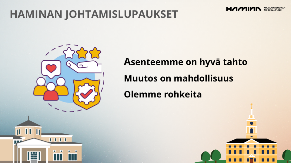 Meidän Haminaa tehdään kaupunkilaisia varten ja johtamislupausten myötä pyritään entisestään parantamaan yhteistä suuntaa maailmanluokan pikkukaupungille. Moderni, inhimillinen ja salliva työkulttuuri antaa työntekijöille tilaa toimia rohkeasti ja tuoda omia kehitysehdotuksia ilmi. Hyvä tahto tärkeänä asenteena ja arvona näkyy niin henkilöstölle, kuin kaupunkilaisille ja yhteistyökumppaneille. Palvelevan kaupungin tavoitteena on olla helposti lähestyttävä, jotta jokainen jolla on kosketuspintaa kaupunkiin, antaa rohkeasti esiin omia näkemyksiään meidän Haminasta ja sen kehittämisestä eteenpäin. Maailmanluokan Hamina on valmis uudistumaan kohti tulevaisuutta ja kehittämään aktiivisesti palveluitaan kaupunkilaisten hyväksi.
