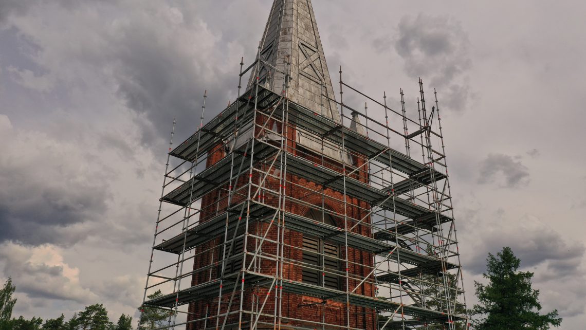 Parhaillaan kirkolla on käynnissä remonttia valmistelevat telinetyöt.