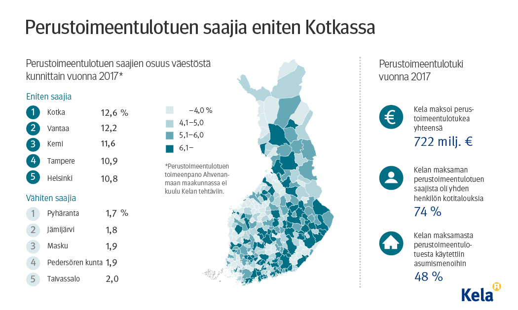 Perustoimeentulotuen käytössä on suuret alueelliset ja kuntien väliset erot. Vuonna 2017 perustoimeentulotuen saajia oli eniten Kotkassa, jossa tukea sai vuoden aikana 12,6 % asukkaista.