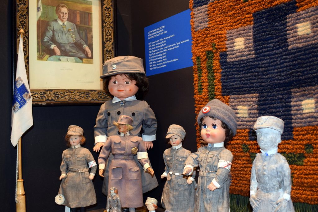 Lotta Svärdin pitkäaikaisimman puheenjohtajan Fanni Luukkosen vitriinissä nähdään lottanukkeja Reima Smedsin kokoelmasta.