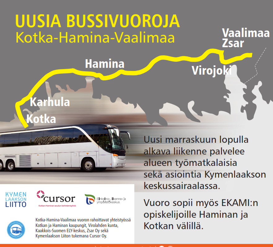 Kotkan-Haminan seutu saa uudet nopeat linja-autovuorot Vaalimaalle. Kolme-neljä kertaa päivässä ajettavat uudet bussivuorot palvelevat etenkin alueen työmatkalaisia sekä mm. asiointia Kymenlaakson keskussairaalassa. Vuoro sopii myös esimerkiksi Ekamin opiskelijoille Haminan ja Kotkan välillä. Linja kulkee myös viikonloppuisin ja se aloittaa liikennöinnin marraskuun lopussa.