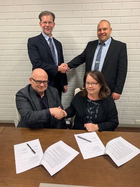 Kaakkois-Suomen Ammattikorkeakoulu Oy:n hallituksen puheenjohtaja Jyrki Koivikko (alhaalla vas.), Kotkan–Haminan seudun koulutuskuntayhtymä Ekamin hallituksen puheenjohtaja Tiina Montonen, Xamkin toimitusjohtaja, rehtori Heikki Saastamoinen (ylhäällä vas.) sekä koulutuskuntayhtymän johtaja, rehtori Sami Tikkanen Ekamista sinetöivät yhteistyön 16.1.2019 aiesopimuksen allekirjoitustilaisuudessa Kotkassa.