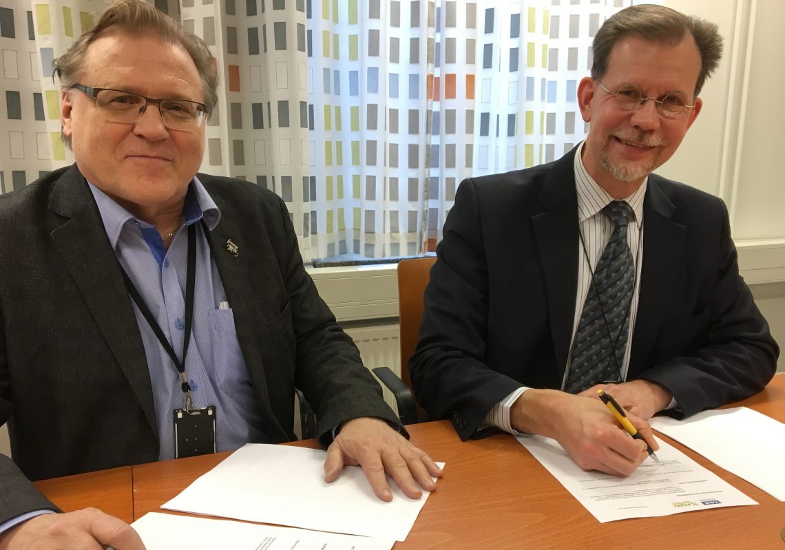 KSAOn rehtori Timo Olli (vas.) ja Xamkin rehtori Heikki Saastamoinen sinetöivät kumppanuuden sopimuksen allekirjoitustilaisuudessa Kouvolassa 30.1.2019.